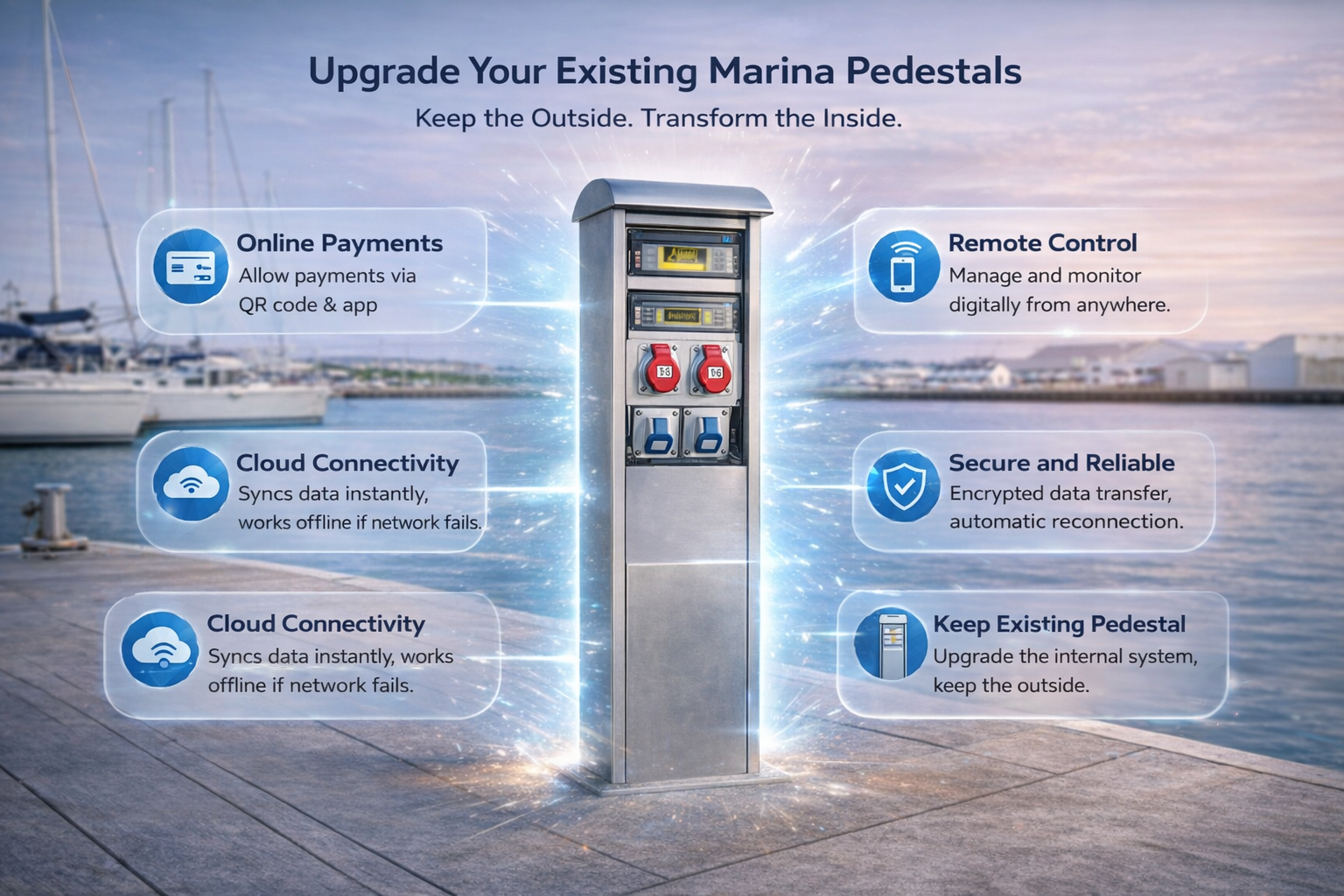 Many ports and marinas operate physical pedestals that are still structurally sound but rely on outdated systems and manual processes. The Marinella NEO Installation Kit is designed to upgrade existing pedestals with modern digital functionality, without replacing the physical cabinet.